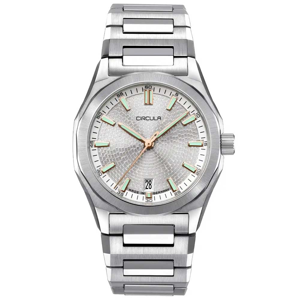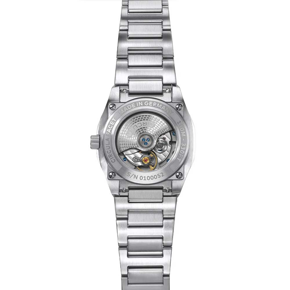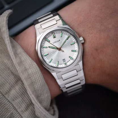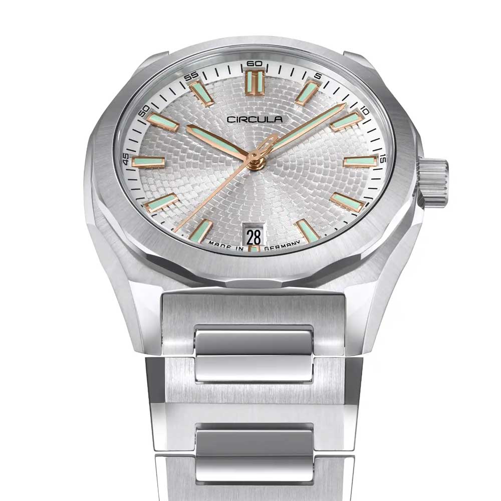For perfekt læselighed sørger diamant-slebne og palladiumbelagte visere, som ligesom de omhyggeligt fremstillede indeks er fyldt med Swiss Super-LumiNova® BGW9 luminiscensmasse. Den fint strukturerede urskive, inspireret af Circulas stiliserede tandhjulslogo, tilfører dybde og spænding til designet gennem sin prægede overflade. Det flade safirglas er indvendigt trefold antirefleksbehandlet og garanterer klar sigtbarhed selv ved direkte lysindfald.