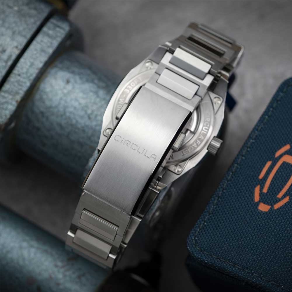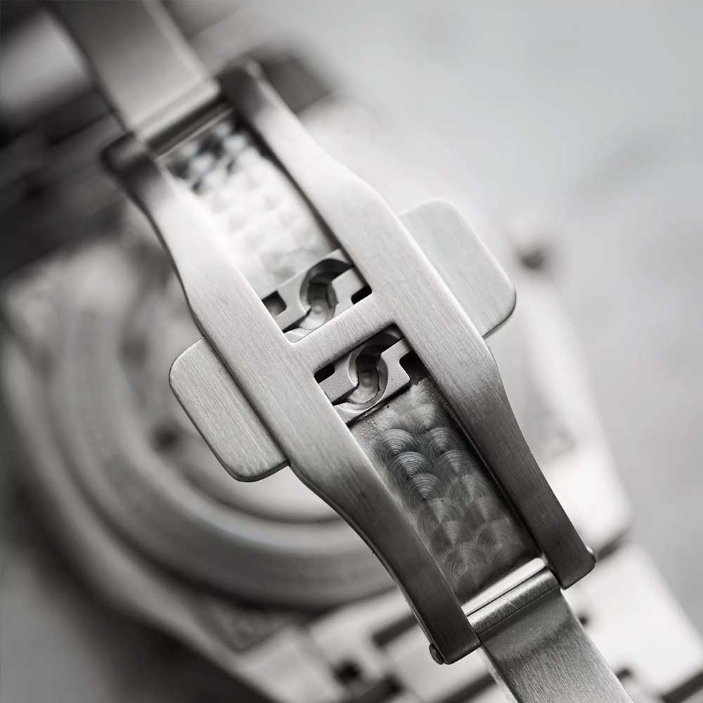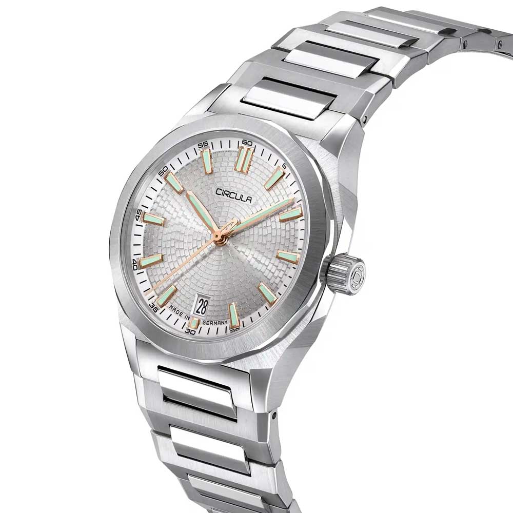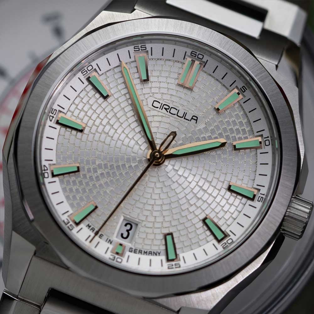 For perfekt læselighed sørger diamant-slebne og palladiumbelagte visere, som ligesom de omhyggeligt fremstillede indeks er fyldt med Swiss Super-LumiNova® BGW9 luminiscensmasse. Den fint strukturerede urskive, inspireret af Circulas stiliserede tandhjulslogo, tilfører dybde og spænding til designet gennem sin prægede overflade. Det flade safirglas er indvendigt trefold antirefleksbehandlet og garanterer klar sigtbarhed selv ved direkte lysindfald.