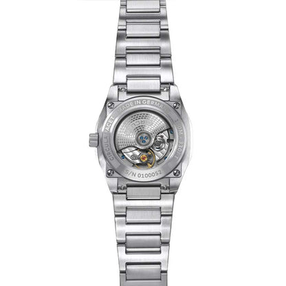 Den todelte urkasse i 316L rustfrit stål imponerer med håndbørstede og polerede flader, der i Pforzheim bliver forfinet med største omhu. Graveringer på urkassebunden samt på kronen sætter diskrete, men effektfulde accenter. Den firedobbelte skruede glasbagkasse i safirglas giver et fascinerende kig på det detaljeret dekorerede urværk.