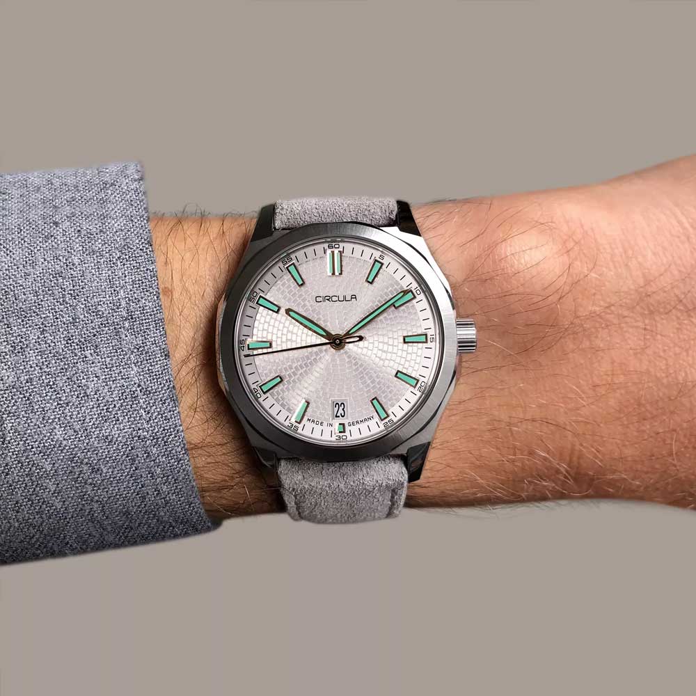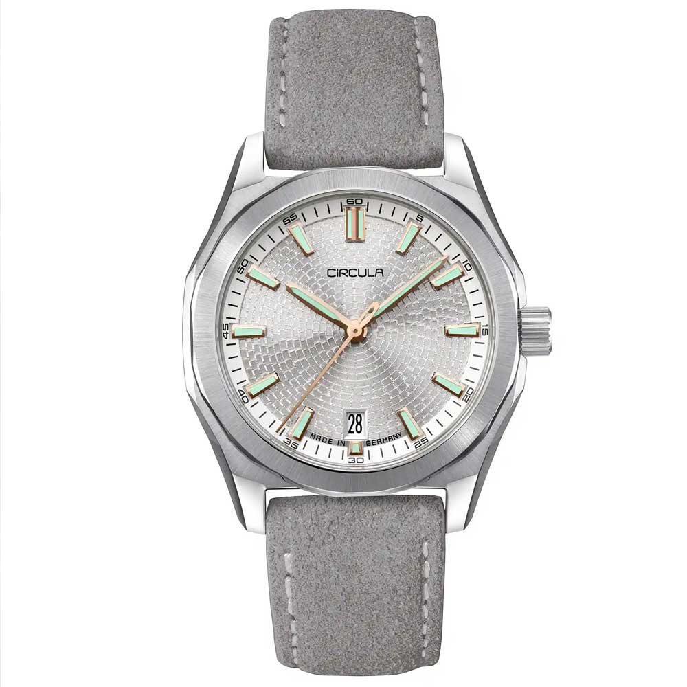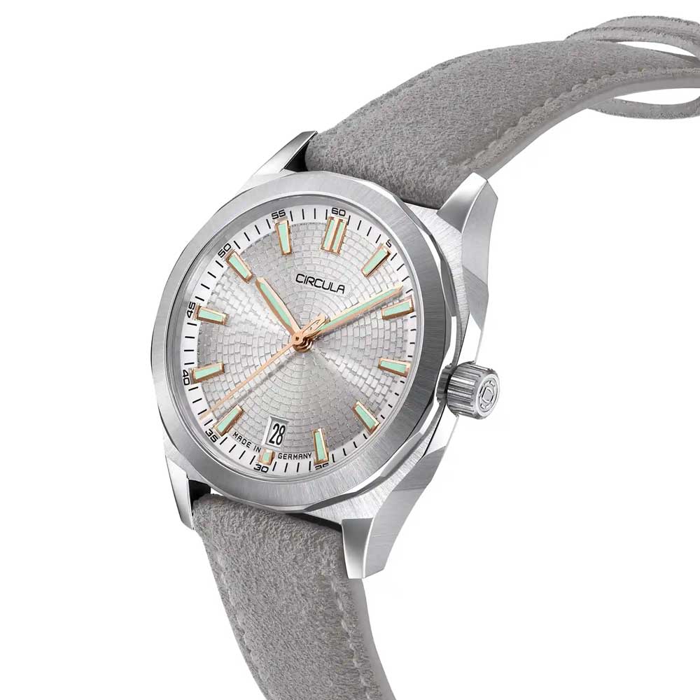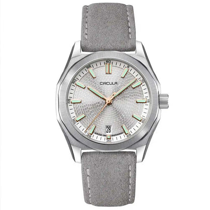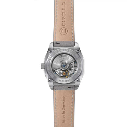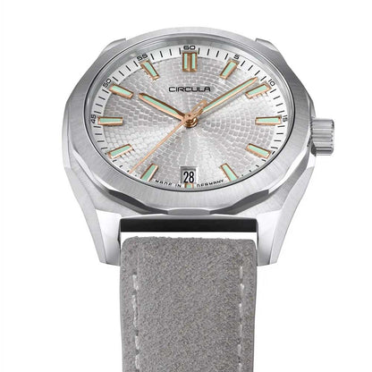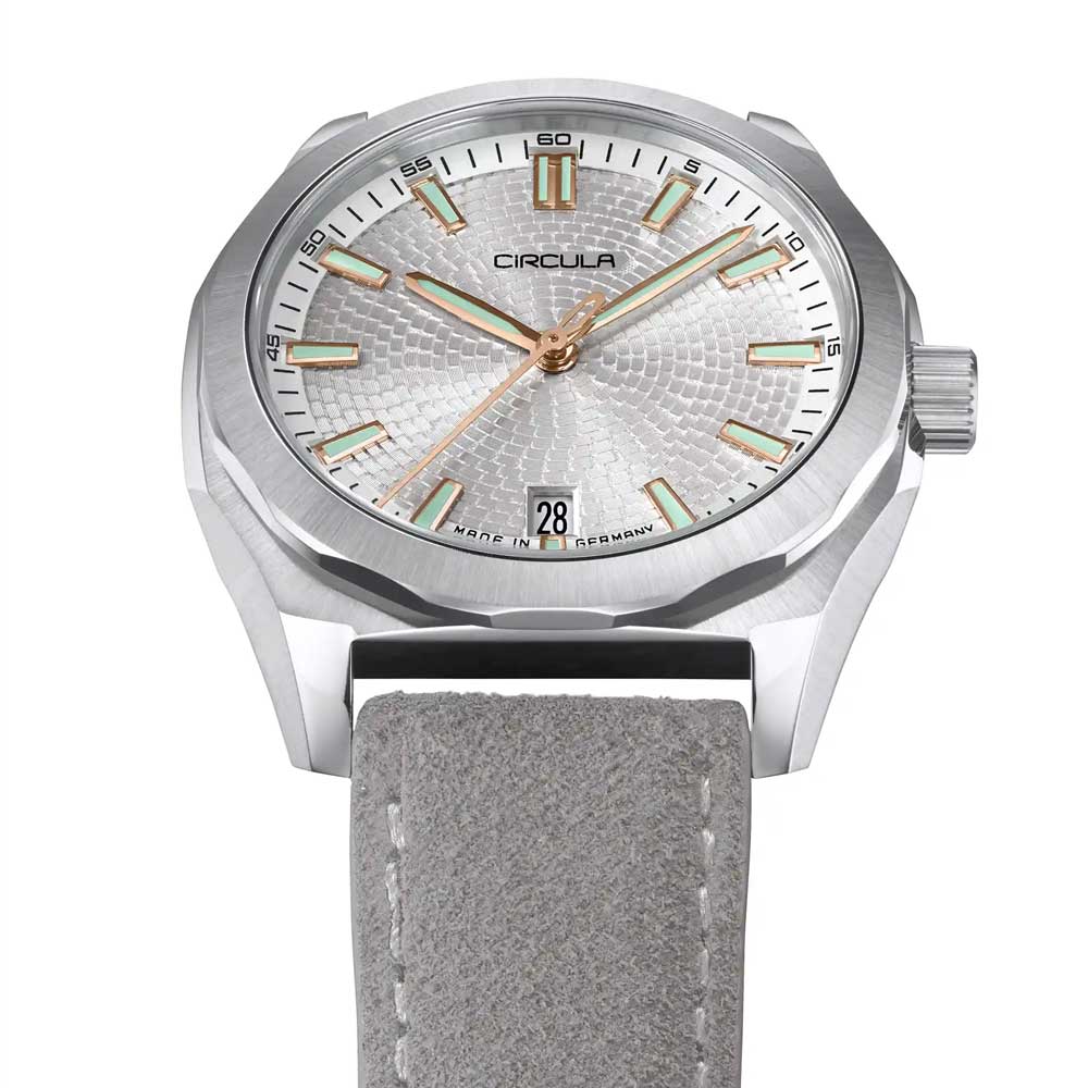 For perfekt læselighed sørger diamant-slebne og palladiumbelagte visere, som ligesom de omhyggeligt fremstillede indeks er fyldt med Swiss Super-LumiNova® BGW9 luminiscensmasse. Den fint strukturerede urskive, inspireret af Circulas stiliserede tandhjulslogo, tilfører dybde og spænding til designet gennem sin prægede overflade. Det flade safirglas er indvendigt trefold antirefleksbehandlet og garanterer klar sigtbarhed selv ved direkte lysindfald.