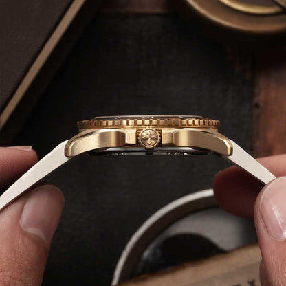 Urværket på Nereide Bronzo er specielt designet til denne model. Det bevarer Nereides karakteristiske stil, men bringer nye designmæssige detaljer i spil. Særligt iøjnefaldende er de påsatte, barformede indekser, hvis satinmatte overflader fremhæver designets geometri. For første gang anvender modellen gyldne trykelementer – en reminiscens til dykkerure fra 1950’erne. En fin, guldfarvet cirkel indrammer urskiven og understreger det harmoniske samspil mellem klassisk vintage-karakter og moderne æstetik.