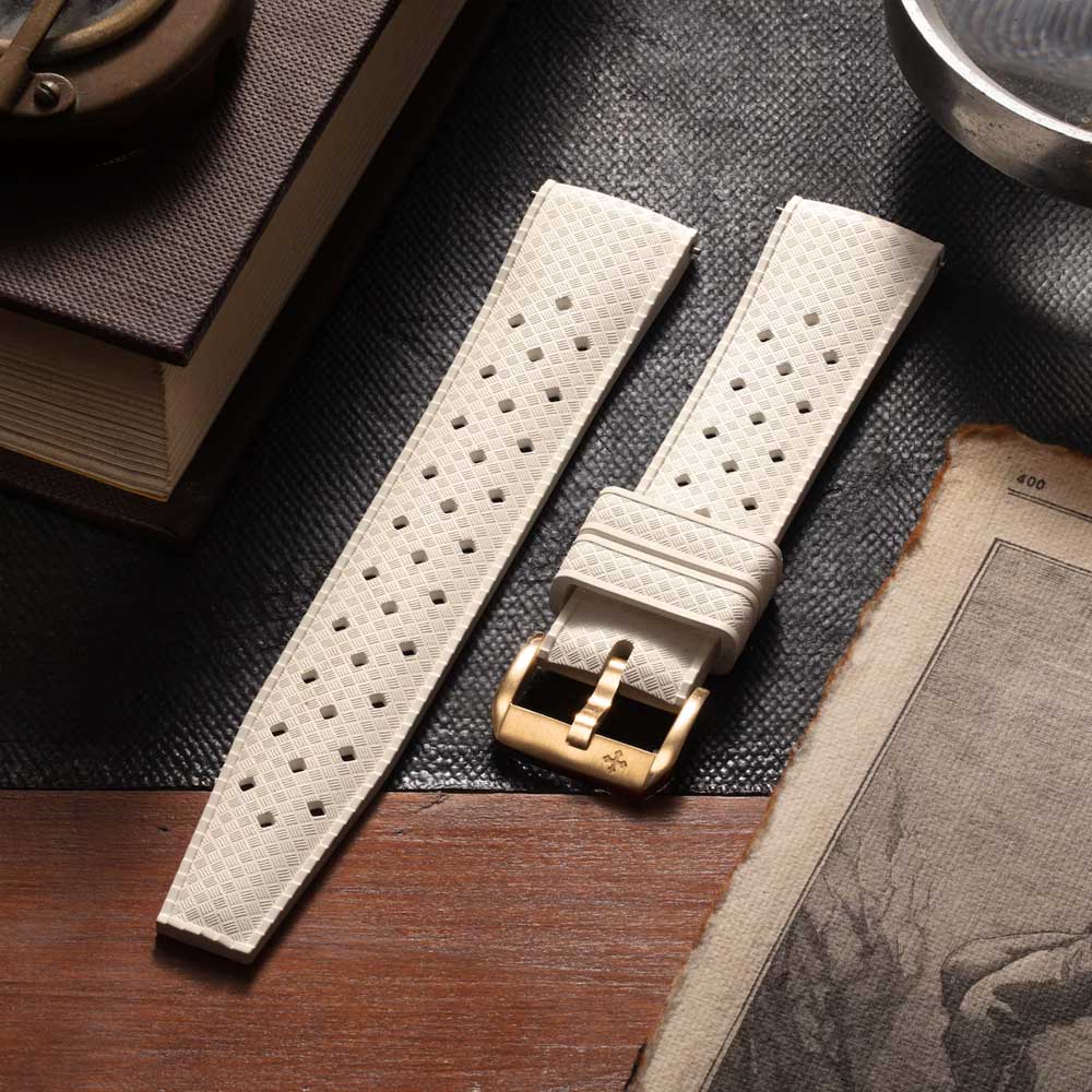 Den anvendte Tropic-rem, oprindeligt udviklet i 60’erne og 70’erne til slanke dykkerure, er fuldstændig revideret til Nereide Bronzo. Fremstillet af galvaniseret FKM-gummi tilbyder den alle fordelene ved originalen: fleksibilitet, lethed og et åndbart design med markant flettet struktur. Takket være moderne materialer er den i dag mere robust og holdbar end nogensinde – perfekt til hverdagen, men også til krævende eventyr.