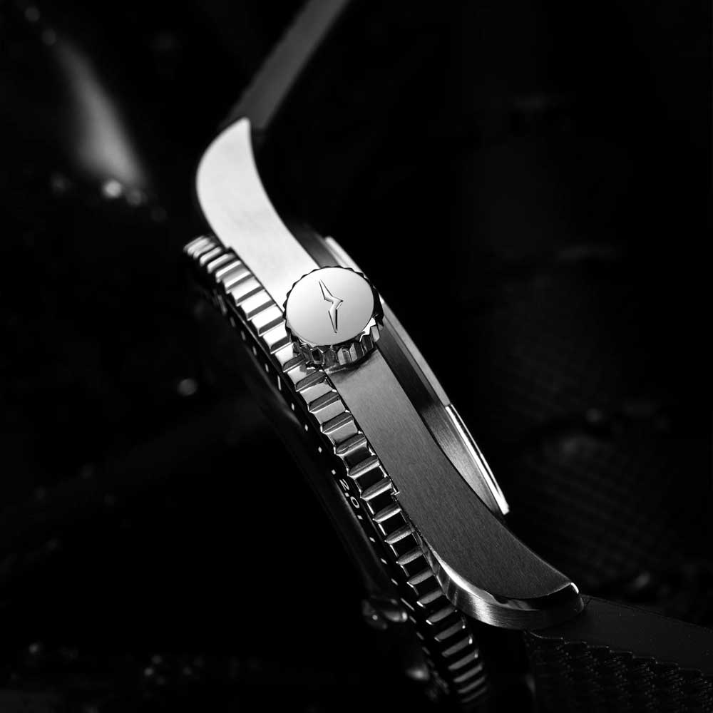 - Kasse: Vertikalt børstet rustfrit stål 316L, ensidet drejelig krans med sort keramisk indsats