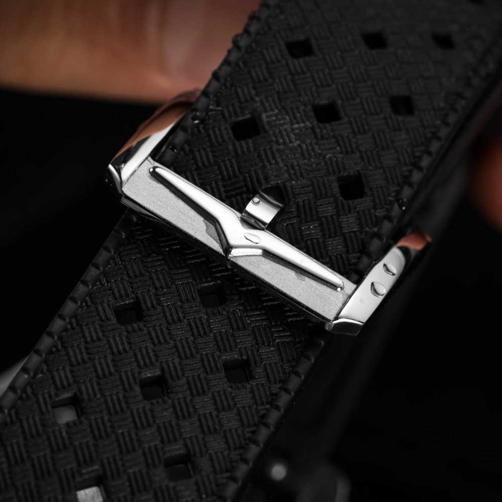 Komfort er i højsædet hos Skindiver Nautique. Det Læderarmbånd med sort carbonprægning og afstemt syning sikrer et sporty-elegant look. Takket være det praktiske Quick-Change-system kan remmen skiftes med få greb – ideelt for bærere, der gerne vil variere.