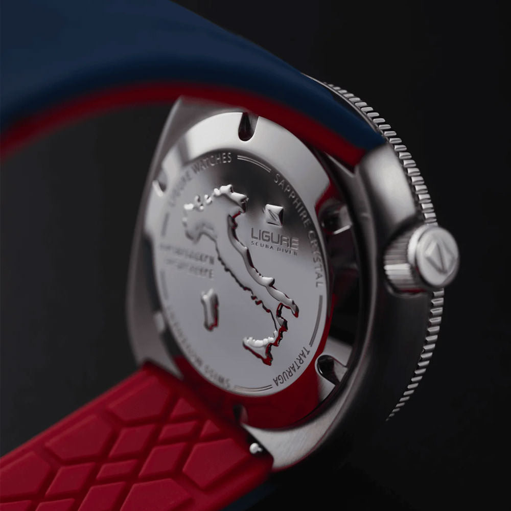 The back of the watch is made of stainless steel. In addition to the raised outline of Italy, the coordinates of Porto Venere are engraved, a reminiscence of a popular diving area in the Ligurian Riviera where many shipwrecks are located.
