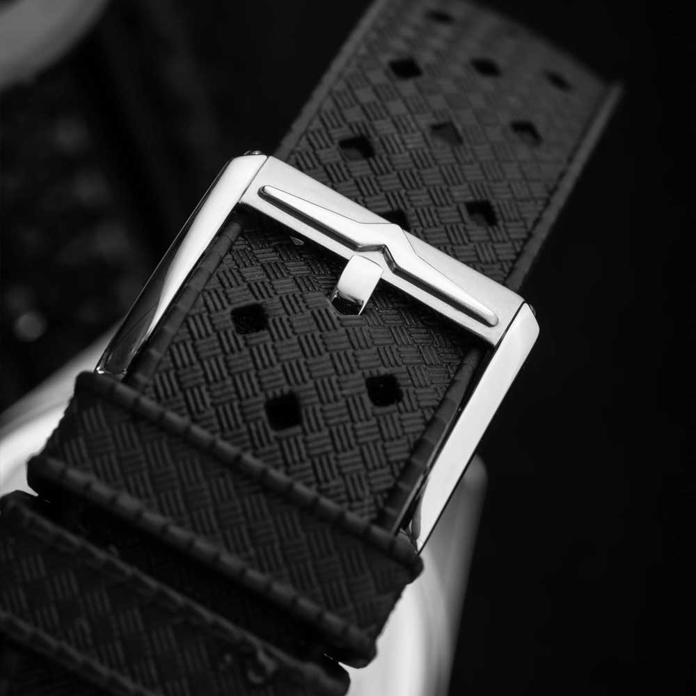 Las agujas en plata pulida armonizan perfectamente con el profundo violeta de la esfera. La clara indicación de horas, minutos y segundos le confiere al reloj una estética equilibrada. Se lleva con una correa de cuero negra con aspecto de carbono, que gracias a un sistema de cambio rápido puede ser intercambiada en cualquier momento por otras variantes. Un detalle pensado que aumenta aún más la comodidad de uso en el día a día.