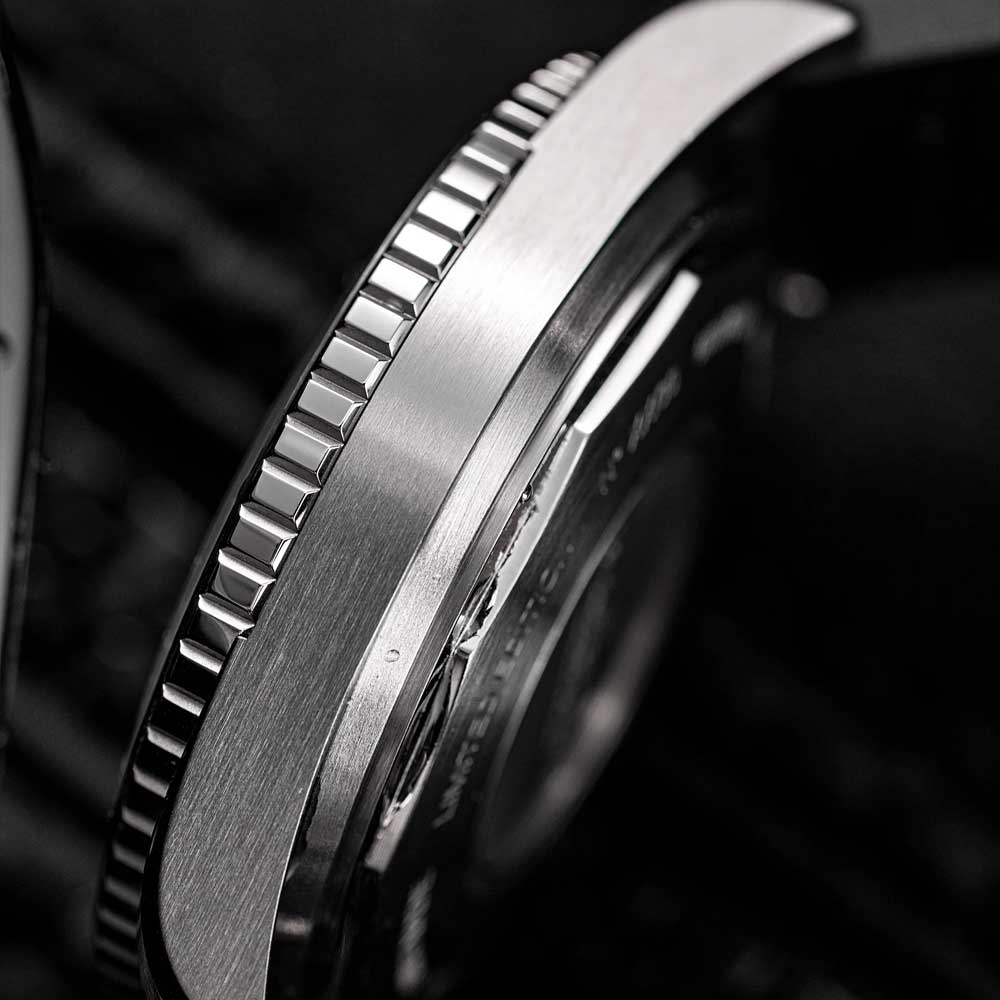 El corazón del Skindiver es el fiable movimiento automático ETA 2824, un clásico probado entre los calibres suizos. Ofrece una reserva de marcha de 38 horas y funciona a una frecuencia de 28.800 semioscilaciones por hora, lo que lo hace no solo robusto sino también preciso. Enmarcado en una caja de 38 mm de acero inoxidable 316L cepillado y equipado con un bisel giratorio unidireccional con inserto cerámico negro, combina lo mejor de dos mundos: auténtica sensación vintage y acabado contemporáneo.