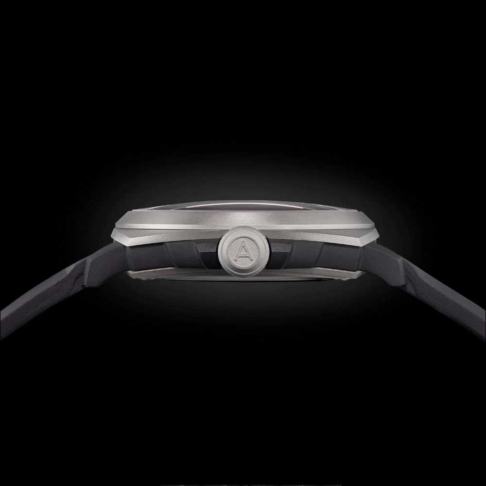 Die Classic-Kollektion bietet Liebhabern einen neuen Blickwinkel auf Andersmann. Die Classic ist nur 12,4 mm dick und wiegt mit dem FKM-Kautschukband 117 g. Das Gehäuse der Classic hat einen Durchmesser von 44 mm und besteht aus mehrlagigem Titan Grad 2. Die mittlere Schicht des Gehäuses besteht aus DLC-Titan. Der Boden der Classic ist ein transparentes, grau getöntes Saphirglas, so dass das ETA 2892-A2 Uhrwerk bewundert werden kann. Das Armband besteht aus FKM-Kautschuk, dem besten Material für Kautschukbänder. Die Classic hat eine Wasserdichtigkeit von 30 bar (ca. 300 Meter).