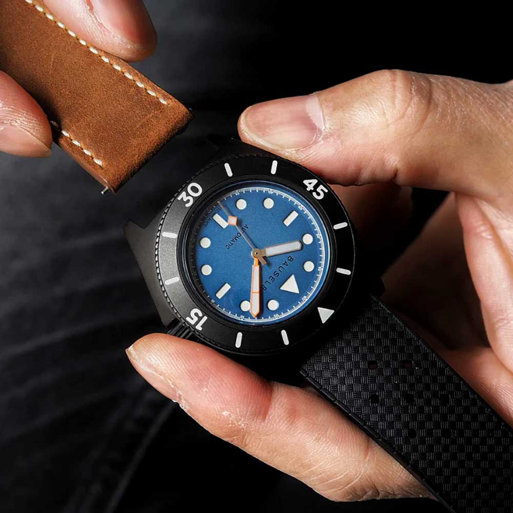 - Standardmäßig wird ein Tropic-Kautschukarmband sowie ein vintage-braunes Lederarmband mitgeliefert.