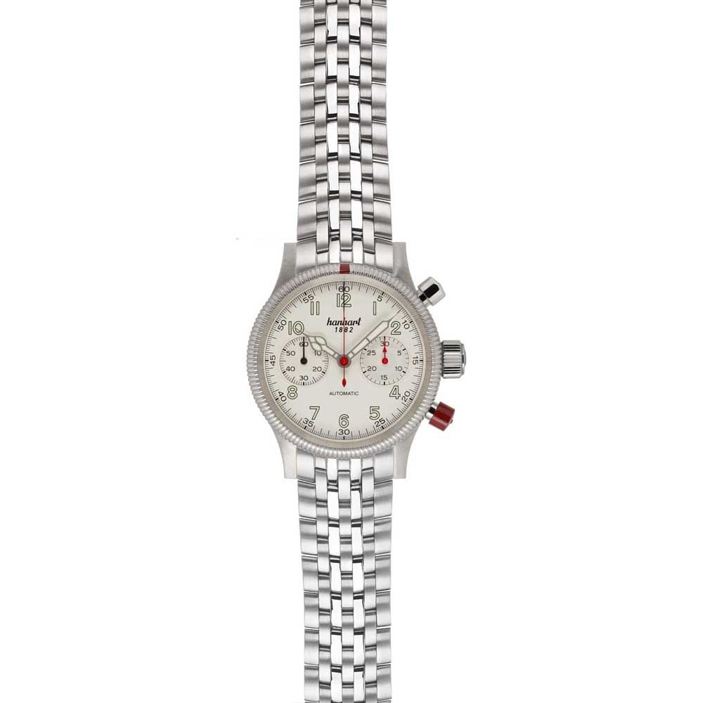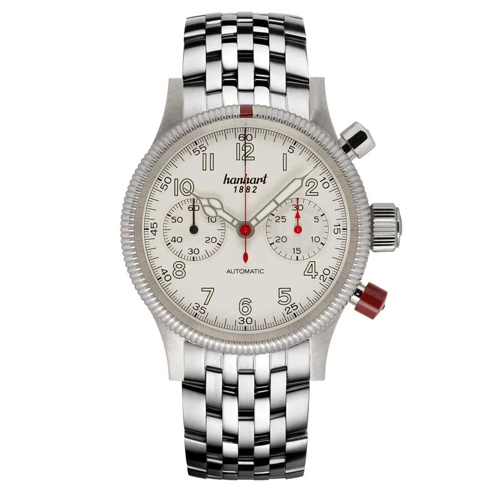 - Zifferblatt: Elegantes Altweiß, inspiriert von Hanharts historischen Fliegerchronographen