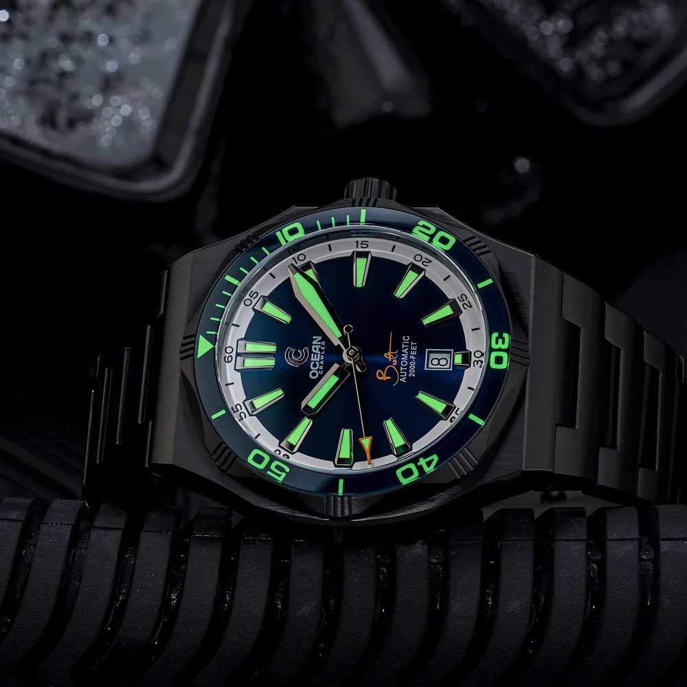 Diese Sonderedition verfügt über eine einseitig drehbare Lünette aus Saphirglas, deren Indexe mit sieben Schichten Schweizer C3 Lume gefüllt sind. Das leistungsstarke C3 Lume auf den Schlüsselelementen garantiert perfekte Ablesbarkeit beim Tieftauchen. Jeder Zeitmesser wird sowohl mit einem integrierten Armband als auch mit einem maßgefertigten Lederarmband geliefert.