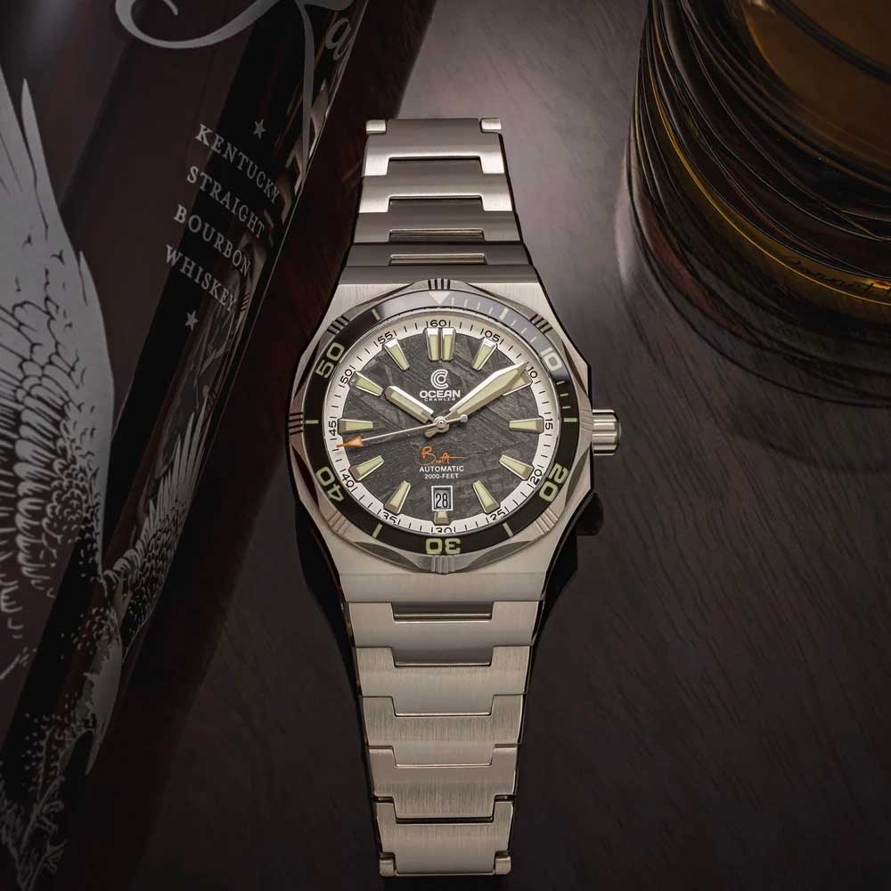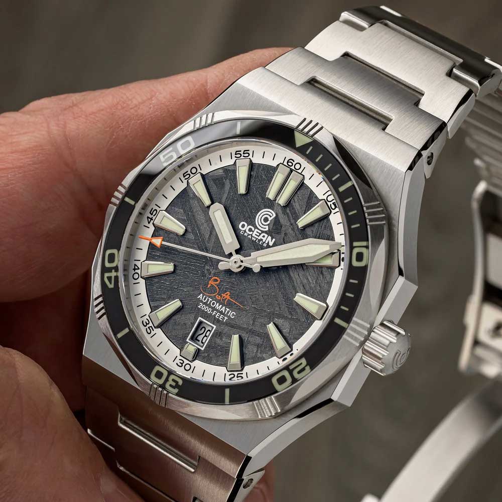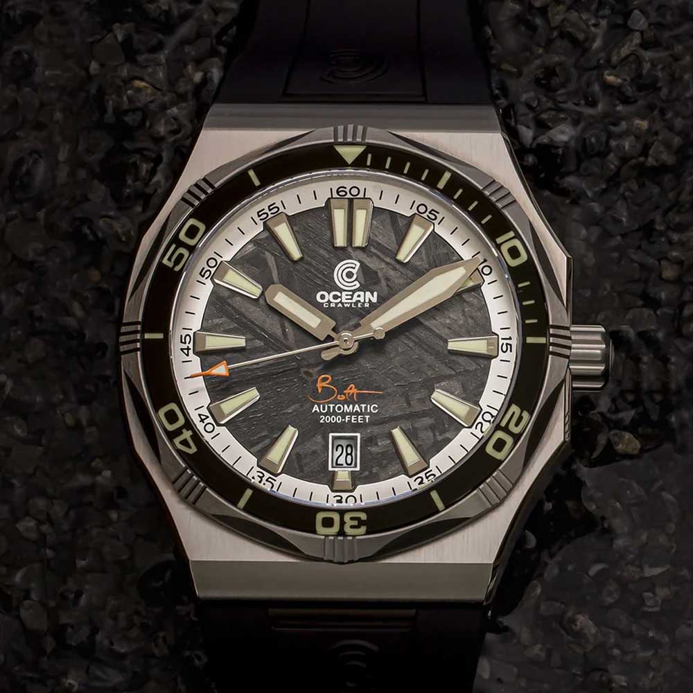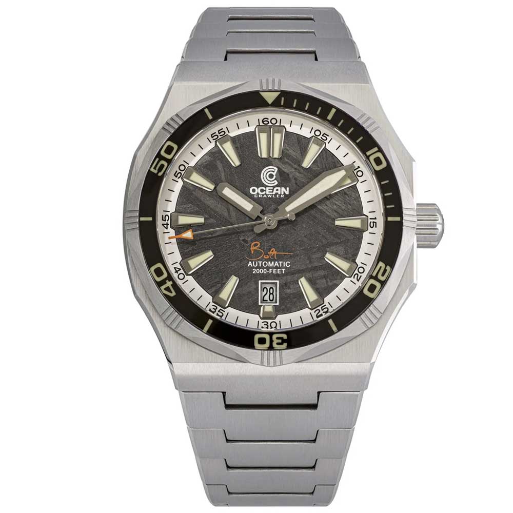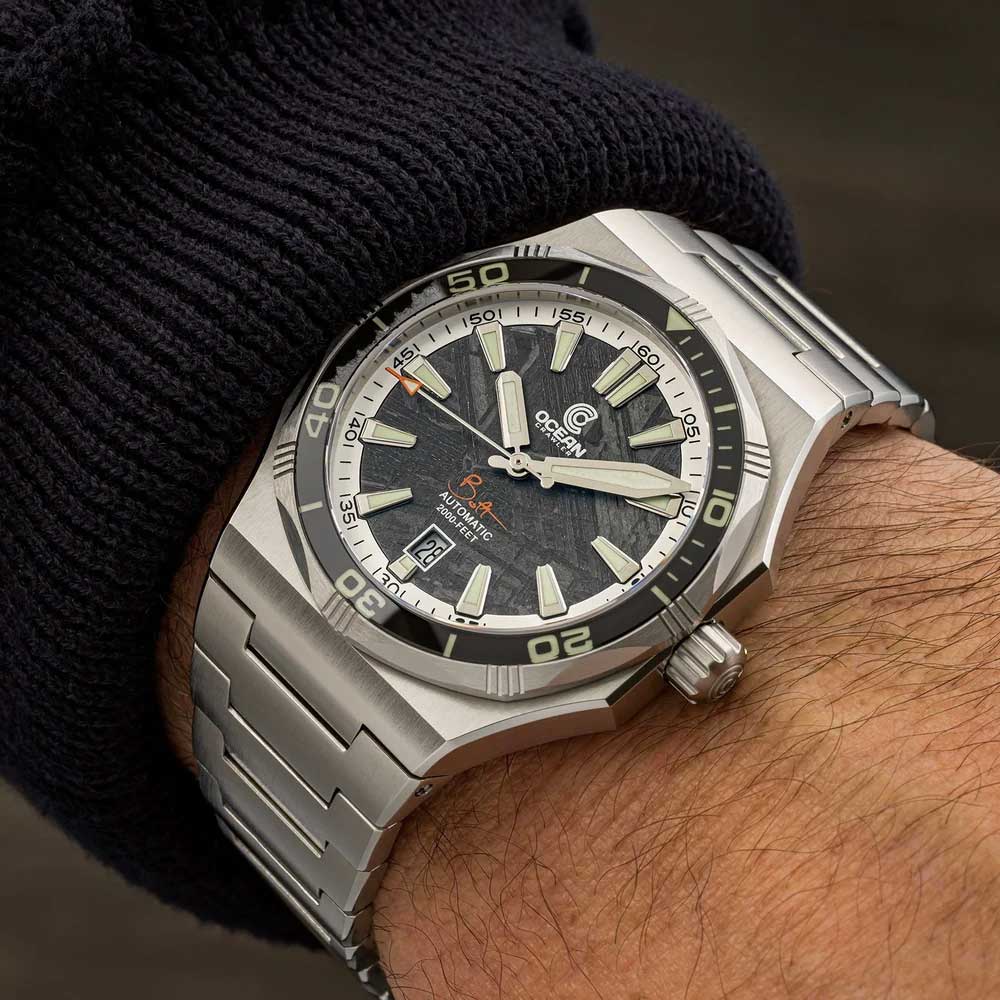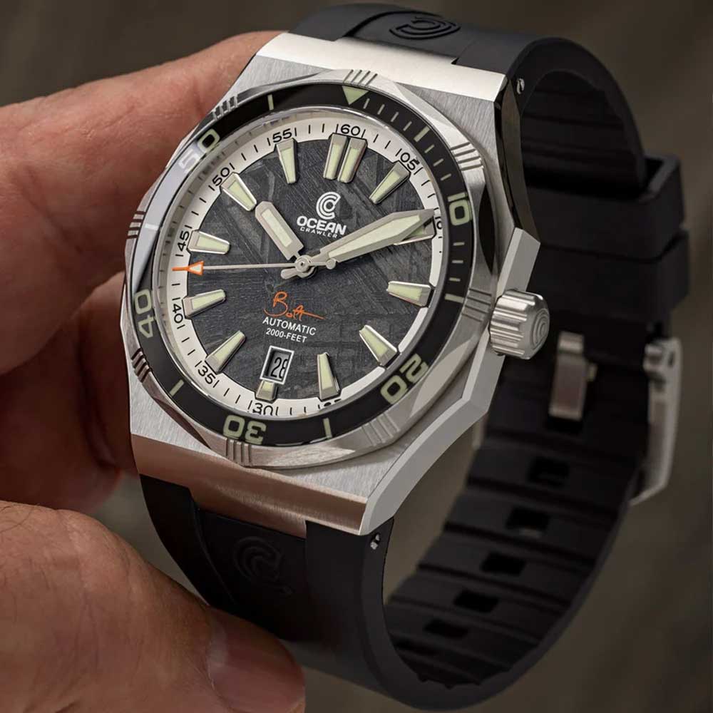 Der Ocean Crawler Bolt kehrt in seinem ikonischen, ultraflachen Design zurück – nun mit drei atemberaubenden Meteoriten-Zifferblättern. Mit einer Höhe von nur 12,3 mm in einem robusten 42-mm-Gehäuse vereint er Eleganz und Funktionalität auf perfekte Weise. Entwickelt für Tauchtiefen bis 600 Meter, ist diese Uhr nicht nur ein Statement am Handgelenk, sondern auch ein verlässlicher Begleiter für anspruchsvolle Tauchgänge.