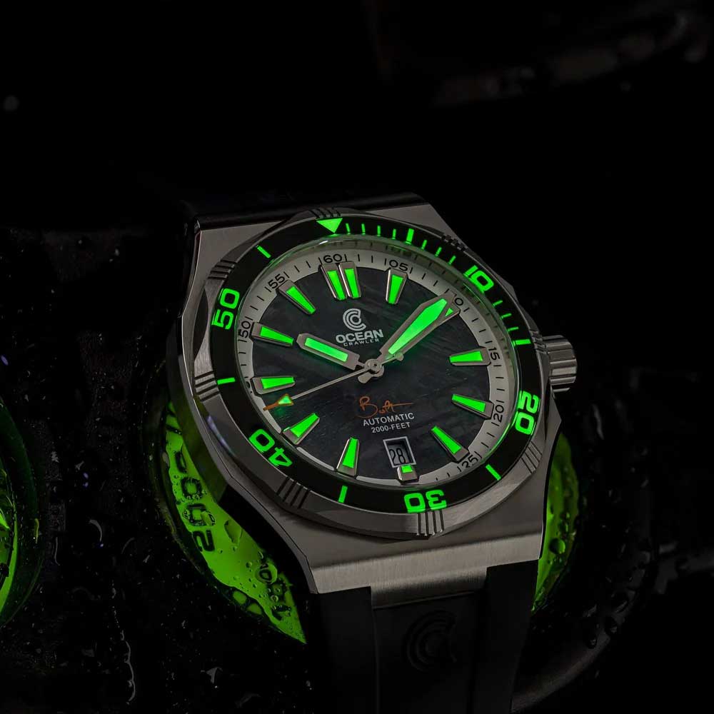 Jede einzelne Ocean Crawler Bolt wird vor der Auslieferung auf ihre Wasserfestigkeit getestet und muss beweisen, dass sie den enormen Druck in 2.000 Fuß Tiefe standhält. Die Uhr verfügt über eine unidirektional drehbare Lünette aus Saphirglas, die mit sieben Schichten Schweizer C3 Superluminova beschichtet ist – für eine optimale Ablesbarkeit selbst in den dunkelsten Tiefen.