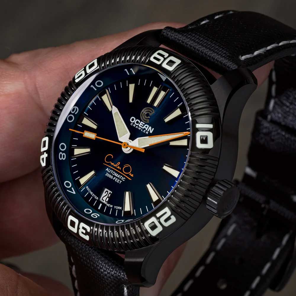 Unverzichtbar für Unterwasserabenteuer, ist die Crawler One extrem stoßfest und bis zu 2000 Fuß (600 Meter) wasserdicht. Sie wird mit zwei Armbändern geliefert: einem speziellen, wasserdichten Canvas-Armband und einem eleganten Lederarmband.