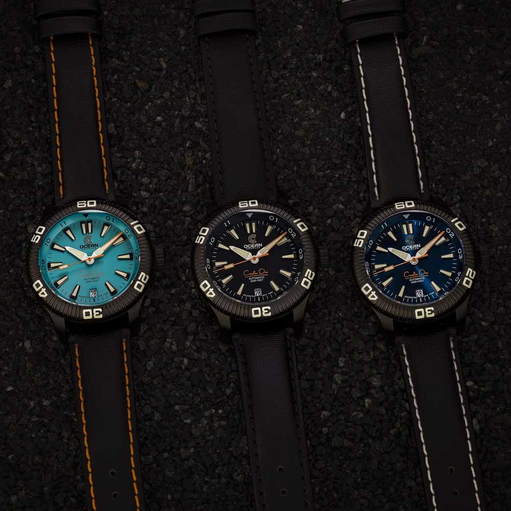 "Die drei Ocean Crawler One gefallen mir auf Anhieb. Die etwas größere Lünette und die Größe von 41mm machen die Uhr für mich sehr interessant. Schwarz ist eh mein Ding, die DLC Beschichtung macht mich schon an. Mein Favorit dieser Drei ist ganz klar die Aqua, da ist der Kontrast schon sehr nice. Einreguliert in 3 Bereichen haben wir eine Ganggenauigkeit vom +/- 8 Sekunden. Aber wie ich Ocean Crawler kenne laufen die wieder wie ne Eins.. Auslieferung ab Ende Oktober. "