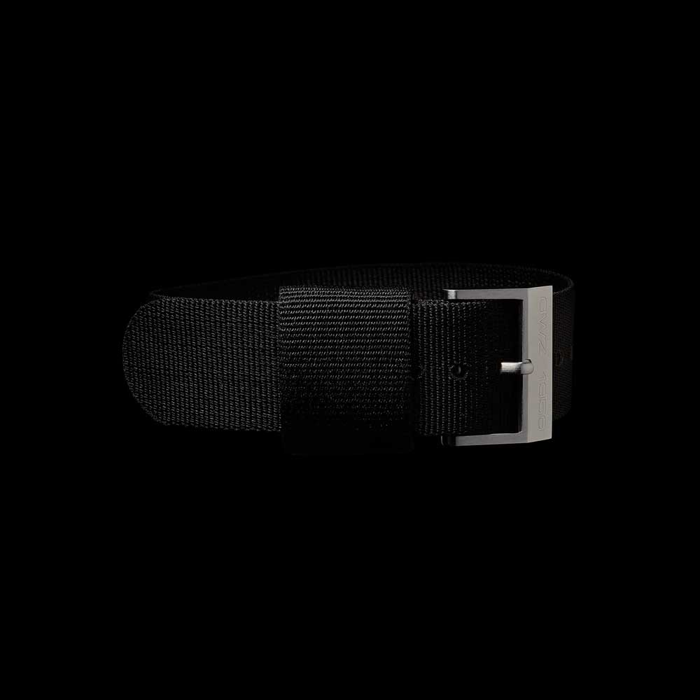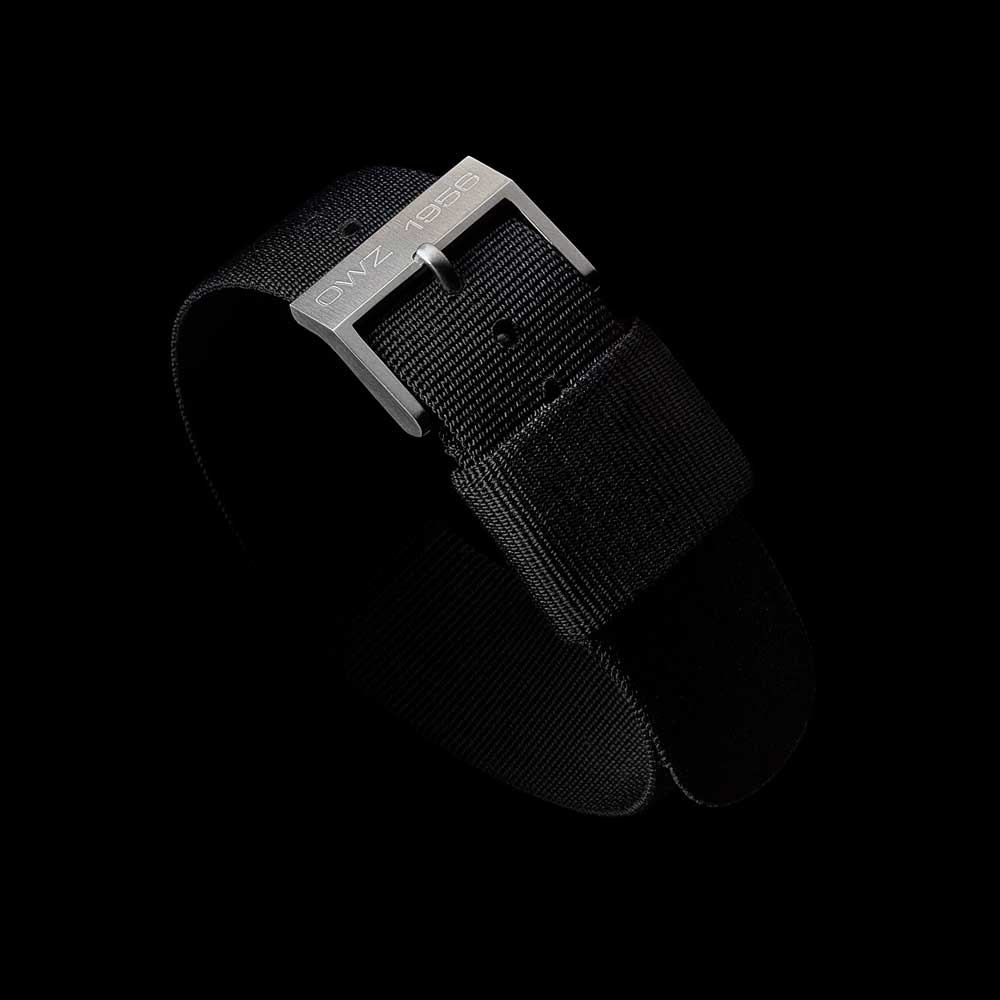 Die M-52B AF wird an einem militärischen schwarzen Nylon-RAF-Armband präsentiert. Ein maßgefertigtes M-Heritage 20-mm-Edelstahl-Mesh-Armband mit handgebürsteter, gravierter Dornschließe kann als zusätzliches Zubehör für 126 CHF bestellt werden.