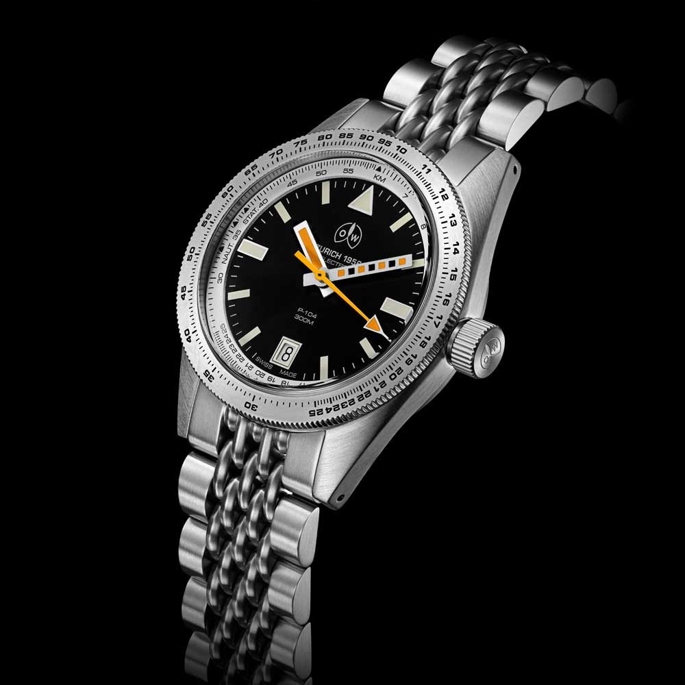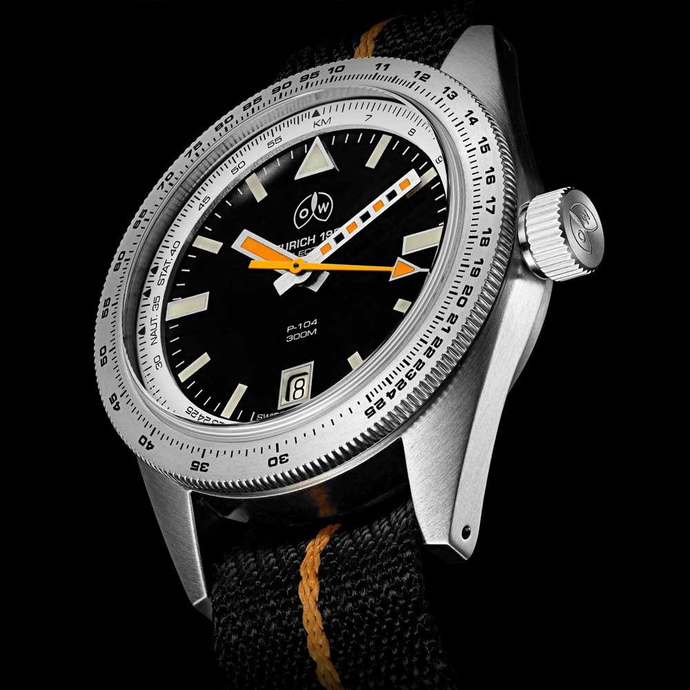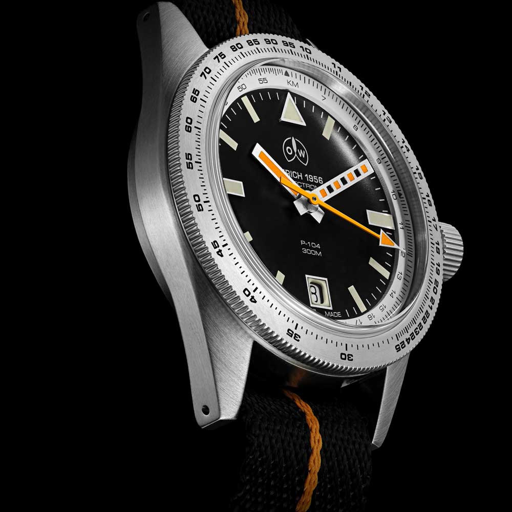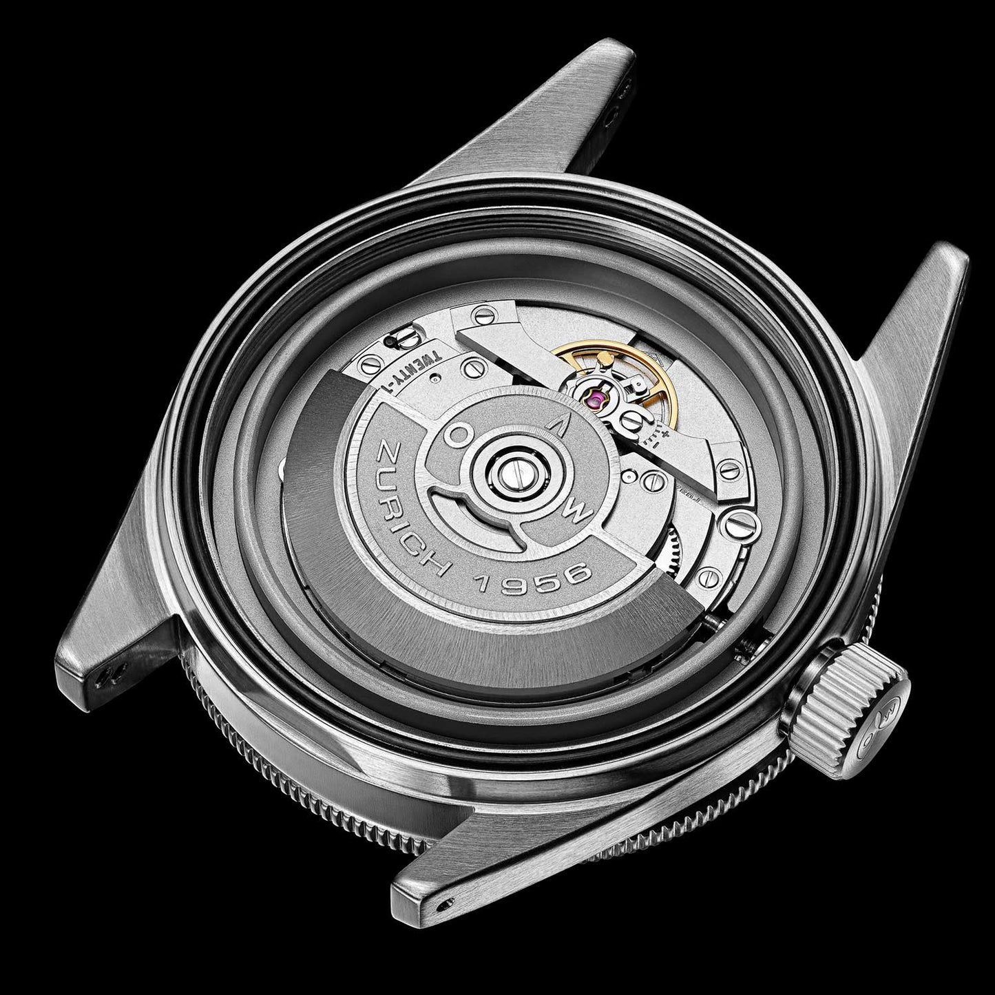 Angetrieben wird die Uhr vom Soprod Newton Precision P092, einem herausragenden Automatikwerk, das speziell nach den Spezifikationen von OW modifiziert wurde. Dieses Kaliber wird in der renommierten Laboratoire Dubois in Chaux-de-Fonds unabhängig auf seine Zuverlässigkeit und Robustheit geprüft. Es wurde in fünf Lagen justiert, mit einem markanten OW-Zürich-1956-Gravur auf der nickelbeschichteten Werkplatte versehen und mit einem speziell gestalteten Rotor in Form des OW-Logos ausgestattet.