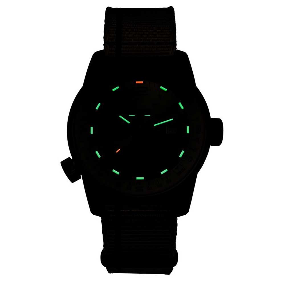 Diese markante Uhr mit einem Durchmesser von 46 mm vereint robuste Materialien mit funktionalem Design. Das PVD-beschichtete Edelstahlgehäuse schützt das präzise Swiss Made Automatikwerk im Inneren und verleiht der Uhr ein modernes, elegantes Aussehen. Das rote Zifferblatt ist mit trigalight- und Super-LumiNova-Leuchtelementen ausgestattet, die zusammen mit den trigalight-Zeigern für hervorragende Ablesbarkeit sorgen, selbst bei schlechten Lichtverhältnissen. Ein entspiegeltes Saphirglas gewährleistet klare Sicht und schützt vor Kratzern. Die verschraubte Krone erhöht die Wasserdichtigkeit der Uhr auf bis zu 10 atm, ideal für den täglichen Gebrauch. Komplettiert wird das Design durch ein robustes NATO-Armband und einen Bandanstoss von 24 mm, das für sicheren Halt und Komfort sorgt.