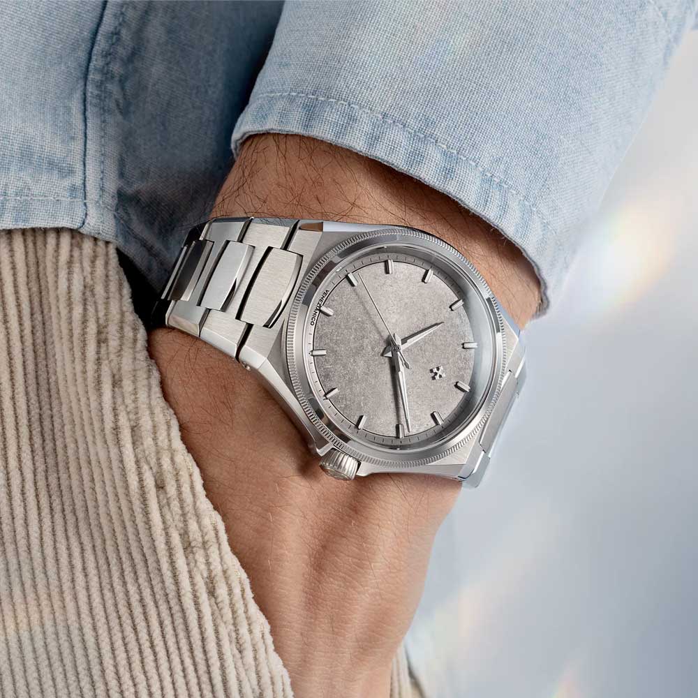 Sowohl das Gehäuse als auch das Armband wurden mit großer Sorgfalt verarbeitet: Vertikale Satinierungen wechseln sich mit polierten Fasen ab, jede Gliedverbindung ist beidseitig abgeschrägt, um ein stimmiges Gesamtbild zu gewährleisten. Besonders die Kombination aus klassisch polierten Dauphine-Zeigern und der spiegelglänzenden Lünette sorgt für eine subtile Spannung zwischen Tradition und Moderne – ein gestalterischer Brückenschlag, der typisch für die Philosophie dieser Uhr ist.