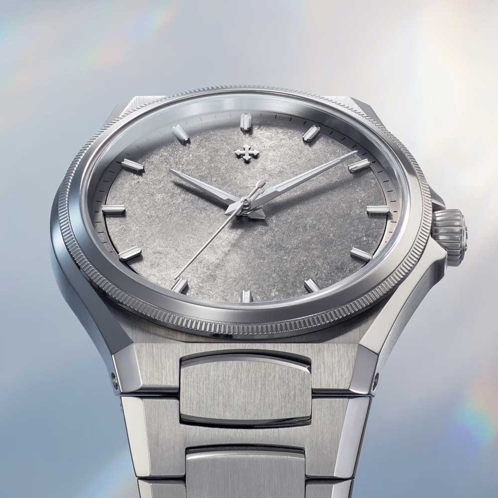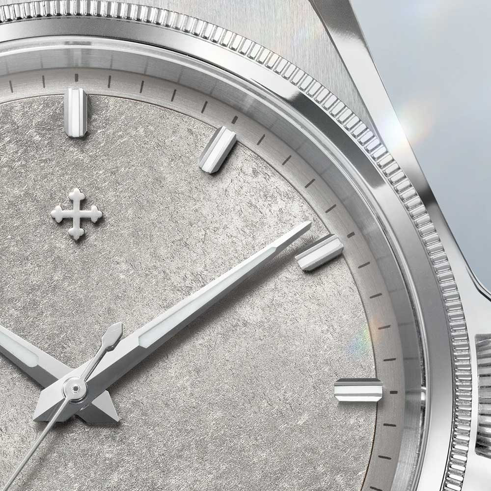 Die besondere Struktur des Zifferblatts entsteht durch ein aufwendiges Trommelverfahren, bei dem die Messinggrundlage in kontrollierten Bewegungen bearbeitet wird. Das Ergebnis ist eine wellige, bewusst unregelmäßige Oberfläche, die jeder Uhr ihre ganz eigene Identität verleiht. Anschließend wird das Zifferblatt poliert und in ein galvanisches Bad mit Platinsalz getaucht. In diesem elektrolytischen Prozess lagert sich eine gleichmäßige, aber dennoch individuell geformte Platin-Schicht ab, die die Textur bewahrt und dabei gleichzeitig veredelt.