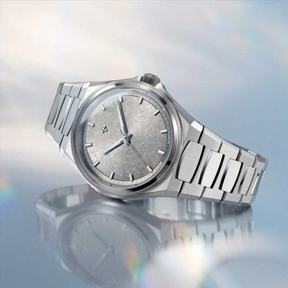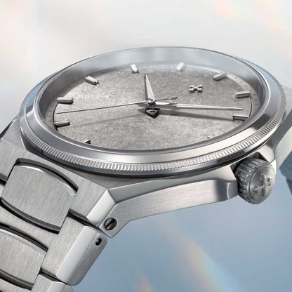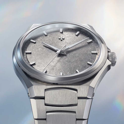 Mit der Arsenale Platino präsentiert sich eine Uhr, die minimalistische Eleganz mit der beständigen Kraft eines der edelsten Metalle der Welt verbindet. Ihr Design ist klar und schnörkellos, doch zugleich spiegelt es eine enorme Tiefe wider – sowohl gestalterisch als auch in der Wahl ihrer Materialien. Im Zentrum steht ein Zifferblatt, das durch ein kontrolliertes Trommelverfahren und eine galvanische Veredelung mit Platin seine charakteristische Oberfläche erhält. Jede einzelne Struktur ist dabei einzigartig – ein lebendiges Spiel aus Licht, Tiefe und Textur, das sich niemals exakt wiederholt.