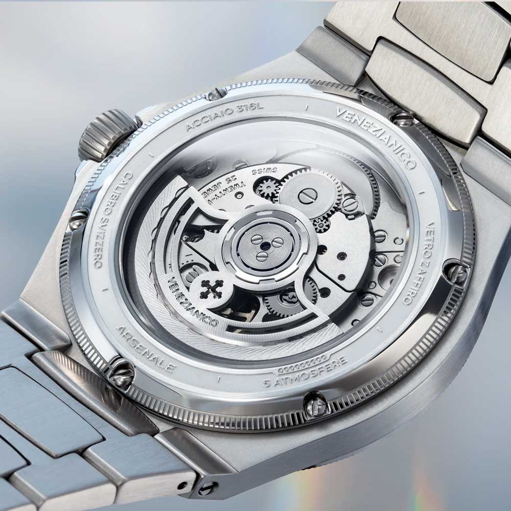 Angetrieben wird die Arsenale Platino vom Automatikkaliber V3250, das auf dem renommierten Soprod M100 basiert. Dieses Werk vereint klassische Schweizer Zuverlässigkeit mit einer präzisen Feinregulierung im Bereich von –4 bis +6 Sekunden pro Tag. Es schlägt mit einer Frequenz von 28.800 Halbschwingungen pro Stunde (4 Hz) und verfügt über eine Gangreserve von rund 42 Stunden – ein Garant für gleichmäßige und ruhige Zeitanzeige.