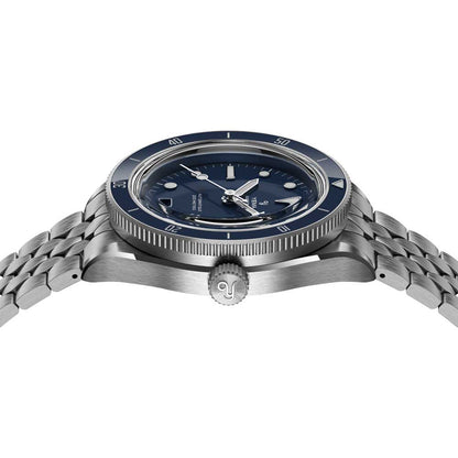Die charakteristische Taucheruhr erhält durch das modernisierte Design ein zeitgemäßes Erscheinungsbild – ganz ohne ihre historischen Wurzeln zu verleugnen. Der markante Gehäuseaufbau mit doppelt gewölbtem Saphirglas bietet eine elegante Silhouette und maximale Kratzfestigkeit. Besonders hervorzuheben ist die überarbeitete Lünette mit verdecktem Arretiermechanismus, die eine deutlich aufgeräumtere Optik ermöglicht. Anders als beim ursprünglichen Modell, bei dem ein sichtbarer Haltemechanismus durch die Krone fixiert wurde, befindet sich das neue System nun vollständig unterhalb der Lünette – unsichtbar, aber spürbar präziser in der Bedienung.