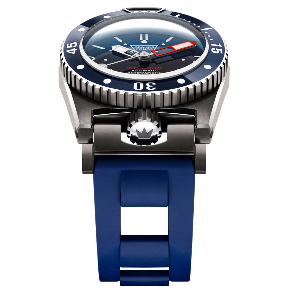Die Grands Fonds 3000 ist eine echte Pionierleistung und stellt einen Meilenstein in der Geschichte der Uhrmacherkunst dar. Sie ist die weltweit erste Uhr, die ohne Heliumventil und mit einer Gehäusedicke von weniger als 20 Millimetern einem Druck von bis zu 5.000 Metern (3000.m geprüft, getestet bis 5.000m) standhält. Dieses technische Wunderwerk wird durch die präzise Verarbeitung ihres Gehäuses aus Grad-2-Titan ermöglicht, das sich durch Leichtigkeit, Festigkeit und Korrosionsbeständigkeit auszeichnet. Die Bauteile des 42 mm großen und 19,5 mm dicken Gehäuses komprimieren unter Druck so perfekt, dass keinerlei Gas eindringen kann. Zusätzlich widersteht der 316L-Stahlboden mit doppelter Titandichtung und Klammer-Ring extremen Belastungen und absorbiert Verformungen.
