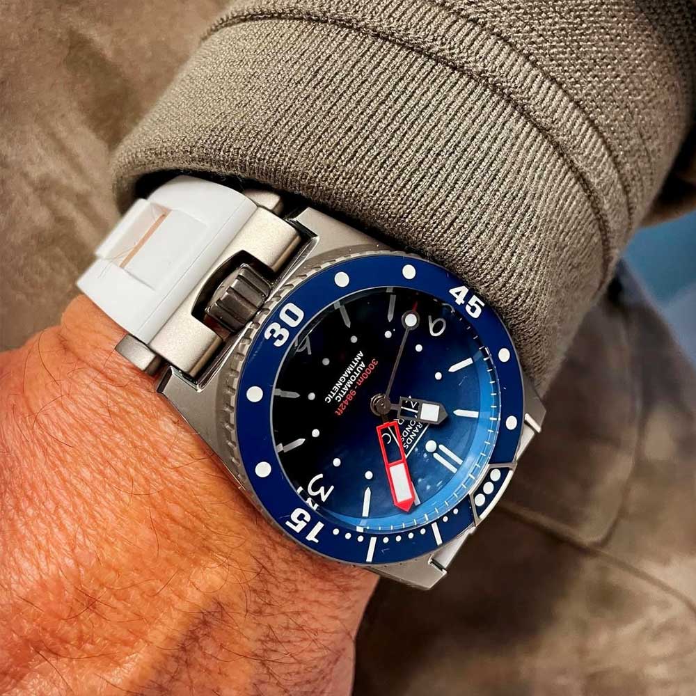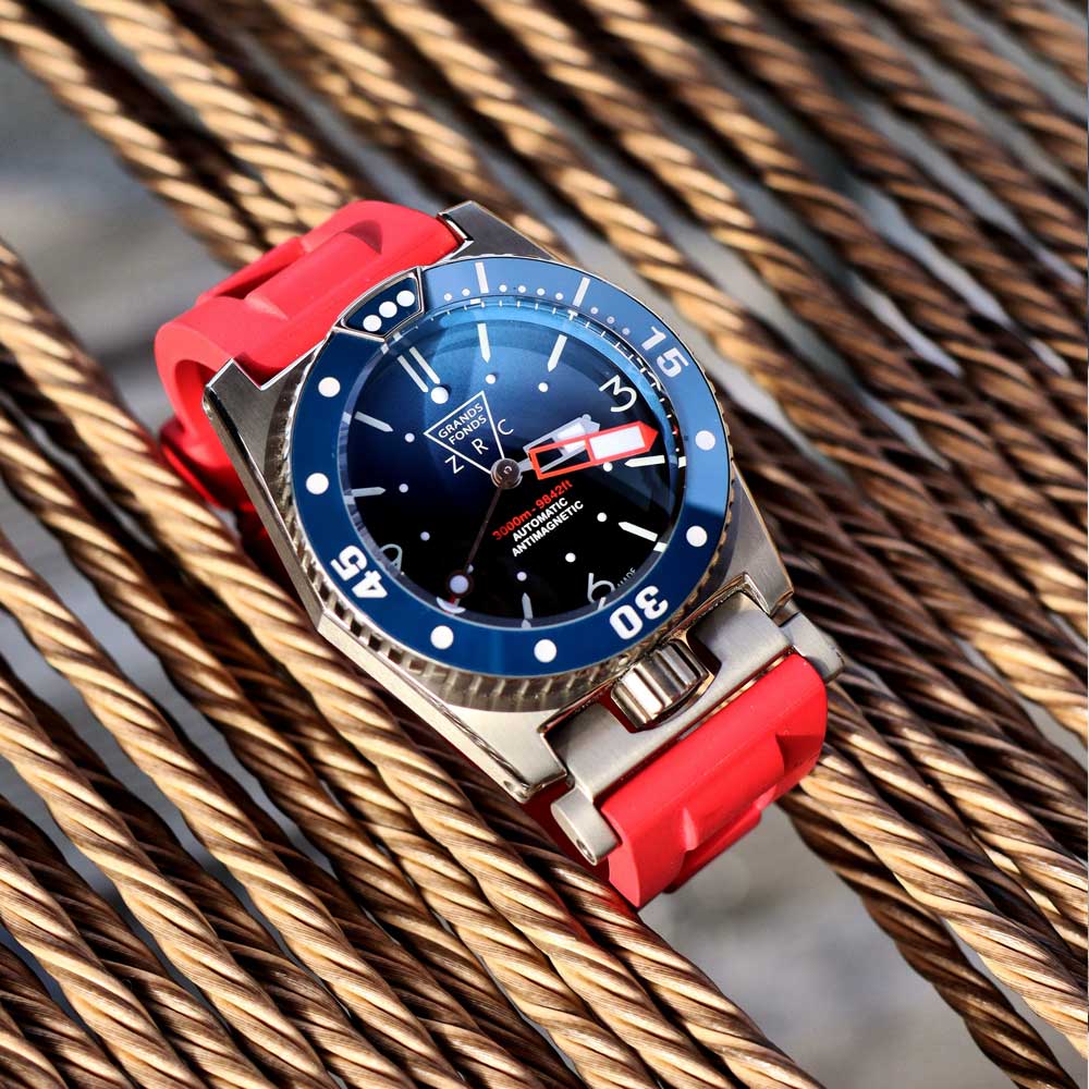 Mit ihrem speziell entwickelten Naturlatex-Armband, das durch eine maßgeschneiderte Titanschließe befestigt wird, ist die Grands Fonds 3000 bereit, die geheimnisvollsten Tiefen der Ozeane zu erobern. Diese Uhr ist nicht nur ein Meisterwerk der Uhrmacherkunst, sondern auch ein Symbol für Entdeckergeist und Abenteuerlust. Sie vereint technische Perfektion, ikonisches Design und eine unübertroffene Leistungsfähigkeit – und bringt damit den Slogan von ZRC auf den Punkt: „Das Leben ist ein Abenteuer“.